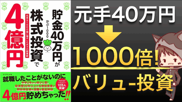「貯金40万円が株式投資で4億円になりました」──このインパクトあるタイトルの書籍は、著者・かぶ1000氏が20年以上にわたって実践してきた”バリュー投資”のエッセンスを凝縮した一冊です。 今回は、バリュー投資の基礎から … 続きを読む かぶ1000貯金40万円が株式投資で4億円に!かぶ1000氏の成功法則とバリュー投資の極意かぶ1000